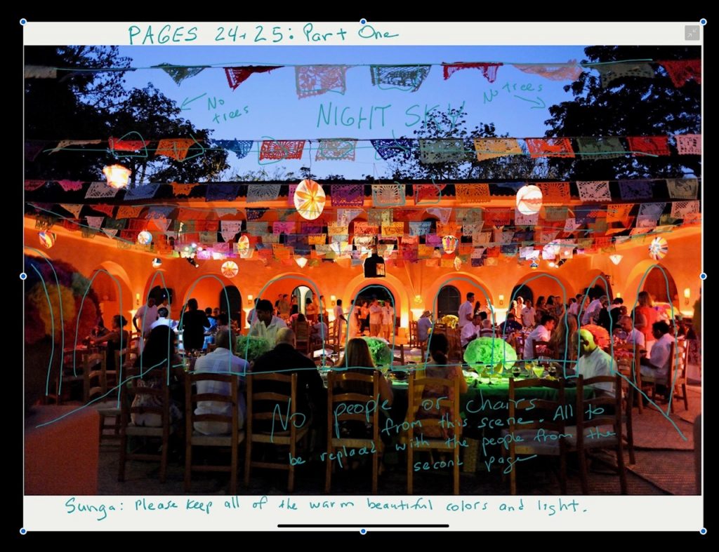 The first draft was great! Mercury House and I had a few ideas for Sunga, like adding detail to the wrought iron lanterns, embroidered flowers on the lady’s dresses and a string of party lights under the bull statue. We even adjusted the skin color of the kids.