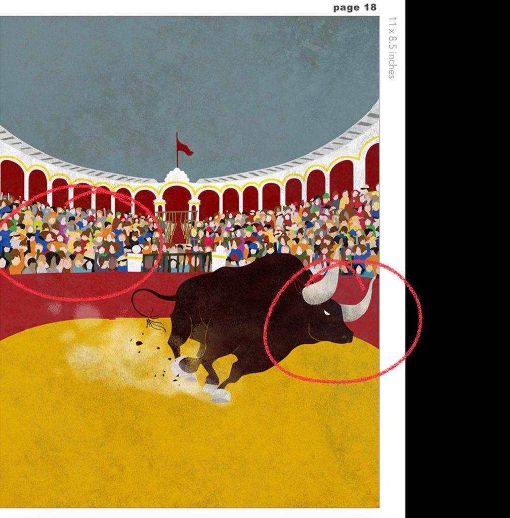 Now that we had established the style of the book, and illustrated a full scene, it was time to create El Toron himself. I looked at many options, from traditional bullfight posters, to modern fairy tale books, to heavily stylized animals, even an Occupy Wall Street ad. But none of them really spoke to me. So the search for the perfect bull went on…